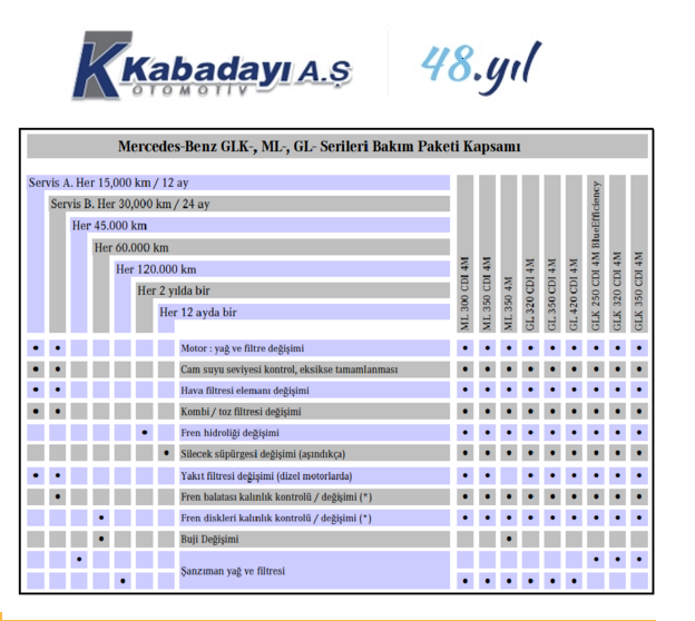 | Mercedes ML/GLK/GL Class - Bakım Çizelgesi |